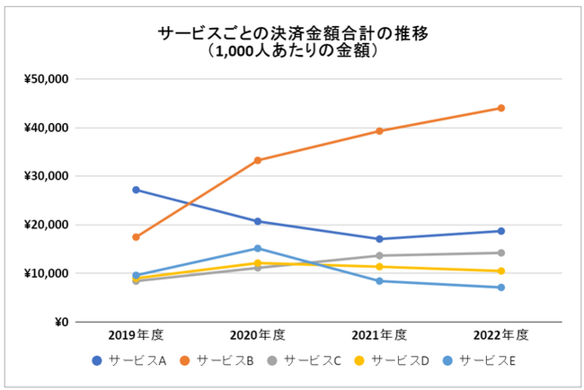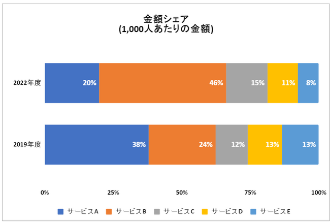 また、 5 つのサービスの決済金額合計に占める割合においても、サービスBが大幅に伸長していました。