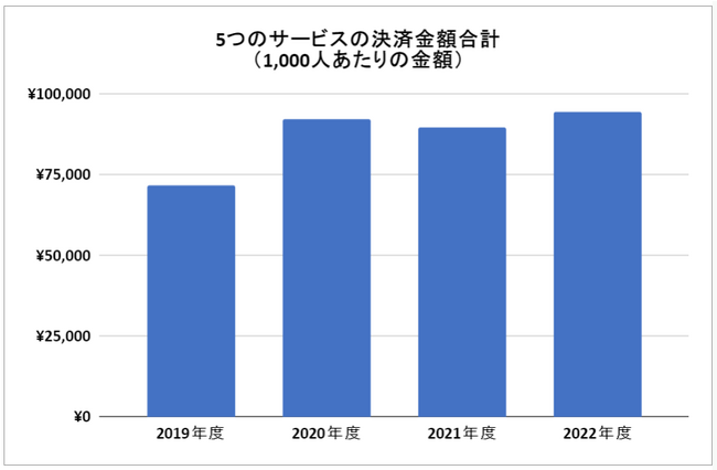 新型コロナウイルスの感染拡大に伴う緊急事態宣言下において、外出自粛の要請により自宅で過ごす機会が増加した中、 2020 年度は前年度に比べて 5 つのサービスの決済金額合計が大幅に伸長しました。