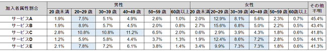 性年代別の表では、サービスA、Bは利用者層が類似しており、 20 代〜 30 代女性、 20 代男性が多い傾向です。