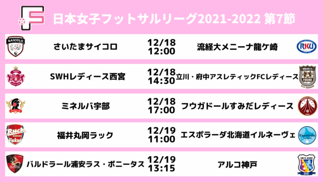 12月18日(土)、19日(日)にバルドラール浦安アリーナにて日本女子フットサルリーグ2021-2022 第7節を開催いたします!今シーズンは、SPOZONEにて生配信しており、無料会員登録すれば全試合無料で視聴可能です。ぜひ、SPOZONEからも応援をお願いいたします!