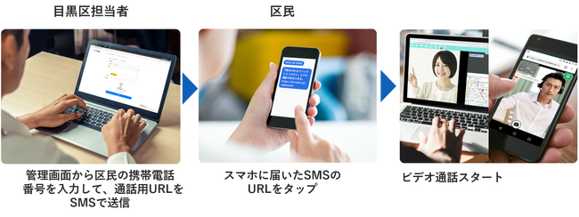 という簡単なステップになります。区民側でアプリのインストールやアカウント作成を行う必要がなく、SMSが届き次第すぐにビデオ通話を始められます。