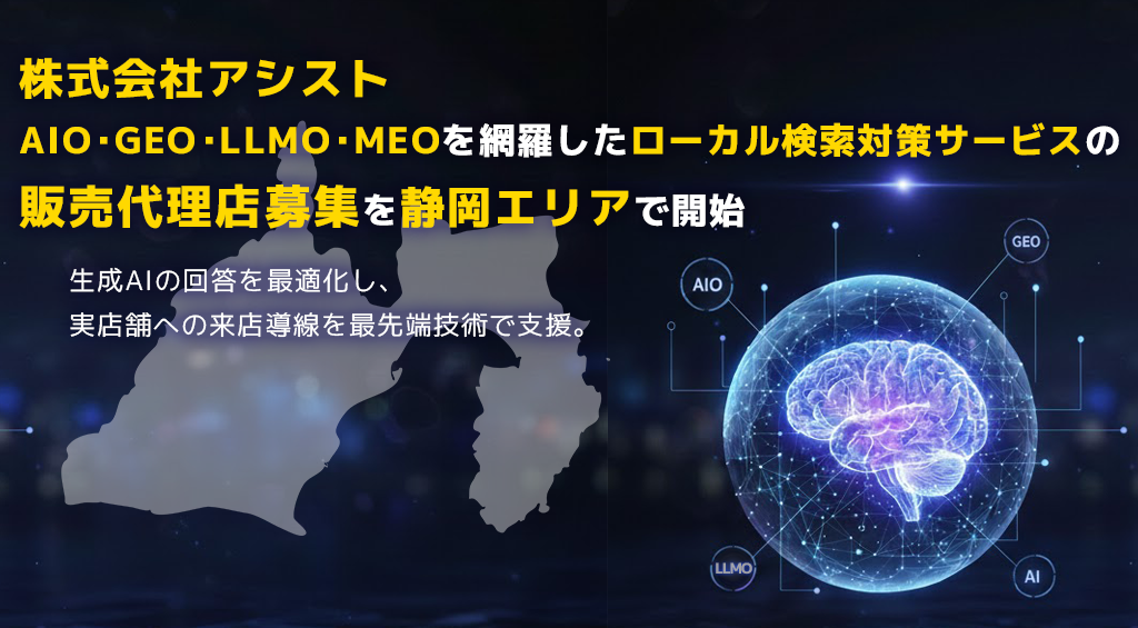株式会社アシスト AIO・GEO・LLMO・MEOを網羅したローカル検索対策サービスの販売代理店募集を静岡エリアで開始。生成AIの回答を最適化し、実店舗とユーザーの出会いを最先端技術で支援。