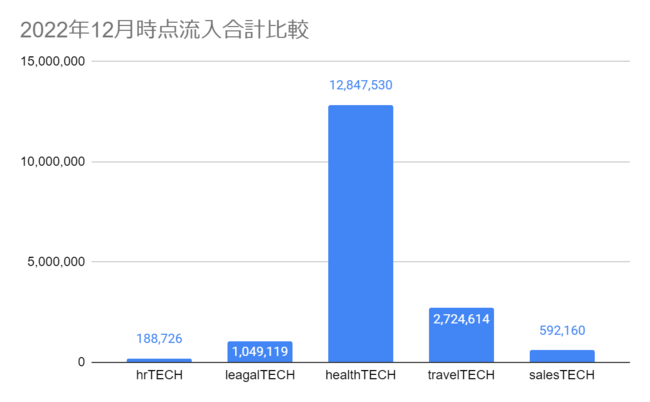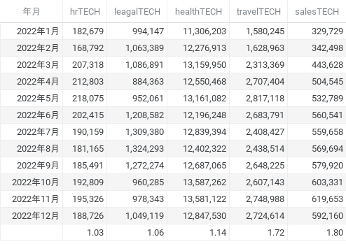 当社が過去に独自調査した、セールステック(SFA)ならびにヘルステック、トラベルテック、リーガルテック、HRテックの5業界について、2022年を通じての検索流入推移から今年の人気や来年以降のトレンドをつかもうとするものです。