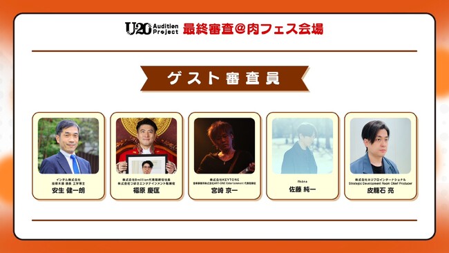 審査員には「REAL AKIBA BOYZ」、ゲスト審査員として、「アニメプロデューサー 福原慶匡」「fhána 佐藤純一」など、エンターテインメント業界で活躍する、様々な面々が集結し最終審査をジャッジする。