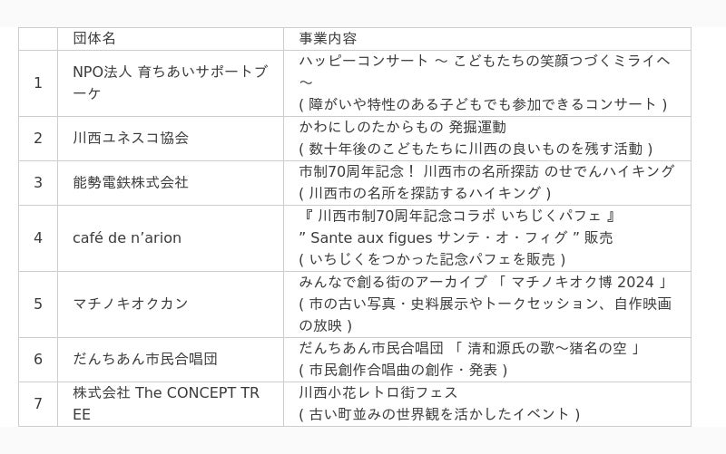 川西市制70周年記念 奨励金を交付する7つの事業が決定! / 兵庫県川西市