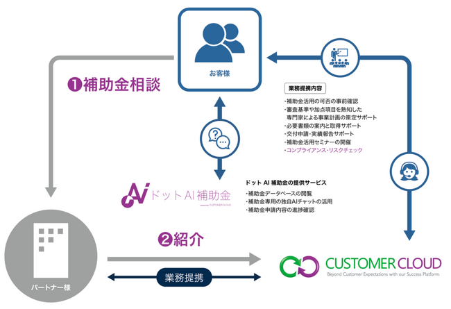 パートナー企業がお客様から補助金申請に関するご相談を承った際、お客様の同意を得てカスタマークラウドの専門家による申請支援サービスをご紹介いたします。