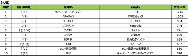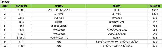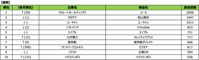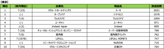 また、Indeed Japan「Indeed」が東京・名古屋地区で5位、リクルートスタッフィングの企業CMが東京地区で10位と、大都市を中心に転職系のCMも多く見られました。