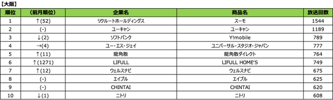 商品別ランキングには入らなかったものの、LIFULL「LIFULL HOME‘S」が東京地区で8位、大阪地区で6位と不動産系のCMが強い印象がありました。