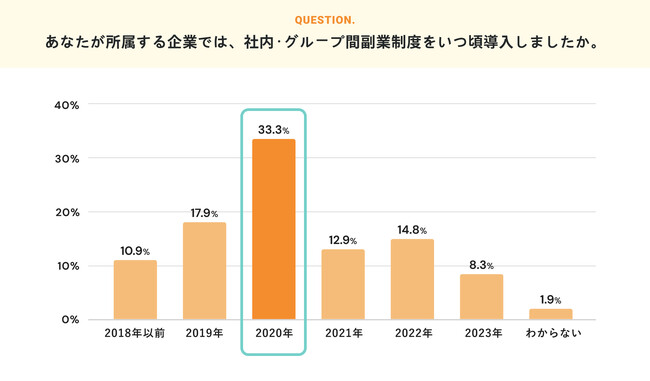 ・社内・グループ間副業を導入した企業が最も多い時期はコロナが流行した“2020年”