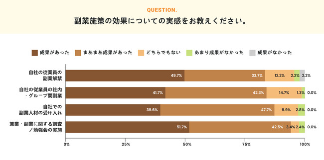 「あなたの所属する企業ではどのような副業施策を行っていますか」と尋ねたところ、“自社の従業員の副業解禁”が最も多く47.1%となりました。次いで“自社の従業員の社内・グループ間副業”となり、40.6%でした。“自社での副業人材の受け入れ”や“兼業・副業に関する調査/勉強会の実施”の回答は30%以下となりましたが、一方で、副業施策の効果実感について伺うと、“兼業・副業に関する調査/勉強会の実施”の回答が最も多く、“まあまあ成果があった(42.5%)”も含めると全体で約90%の企業が成果を感じていることが分かりました。