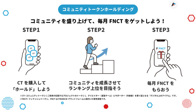FiNANCiEではこのトークンを『CT(コミュニティトークン)』と呼んでいます。ユーザーは応援したいプロジェクトのCTを持ち続ける(保有する)と、様々な“限定特典“が受けられるようになり、さらに『ホールド(CTH)』して応援を継続することで、株式会社フィナンシェが発行する暗号資産“FNCT”がもらえるチャンスも生まれます。