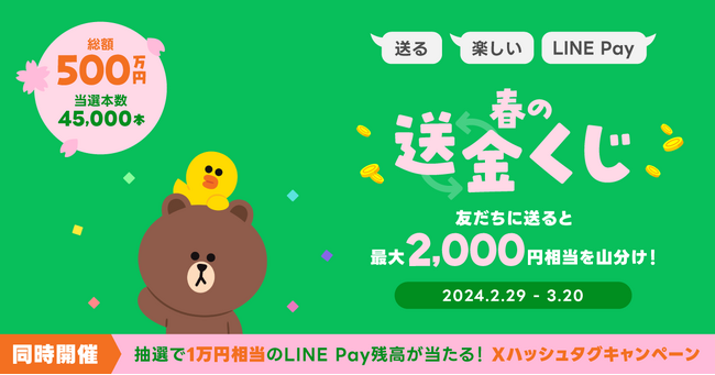 LINEヤフー株式会社のグループ会社である、LINE Pay株式会社は、2024年2月29日(木)10:00から3月20日(水)23:59まで、最大2,000円相当のLINE Pay残高が抽選で当たる「春の送金くじ」を開催します。あわせて、キャンペーン条件を達成した方の中から抽選で10名に1万円相当のLINE Pay残高が当たる「Xハッシュタグキャンペーン」も開催します。