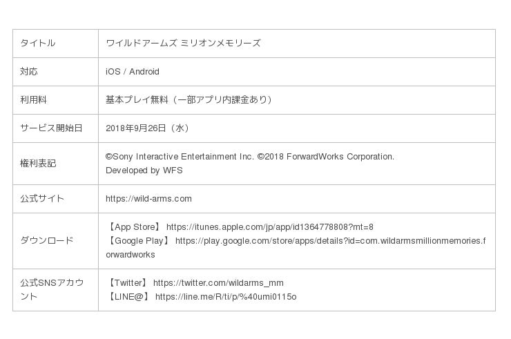 『ワイルドアームズ ミリオンメモリーズ』は、シリーズのゲームデザインを手掛けてきた金子彰史が制作総監修を務め、本作オリジナルのキャラクターのほか、シリーズから歴代の主人公をはじめとするキャラクターたちが登場し、惑星ファルガイアを舞台に魅力的なキャラクターたちが織りなす新しい物語を描きます。また衝撃的なプロローグで始まるドラマティックな物語とともに、新しい試みを積極的に取り入れてきたシリーズの良さと、スマートフォンならでは操作性を活かした爽快感のあるアクションバトルをお楽しみいただけます。