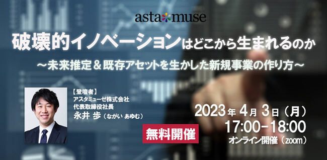 アスタミューゼ株式会社(本社:東京都千代田区、代表取締役社長 永井歩)は、2023年4月3日(月)17:00-18:00に、新規事業の企画や推進に関する課題をお持ちの経営者や担当者向けの無料ウェビナー「破壊的イノベーションはどこから生まれるのか 〜未来推定&既存アセットを生かした新規事業の作り方〜」を開催いたします。本年1月に開催し、ご好評いただいた同タイトルのウェビナーをアップデートした内容となります。