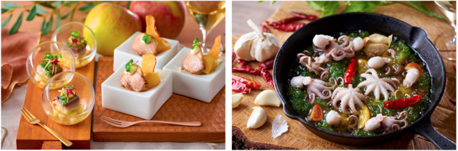 右:食事のスターターにお薦めの「オーシャンタルティーヌ」。白ワインと一緒に一口サイズのアミューズとしてお楽しみください。
