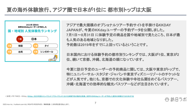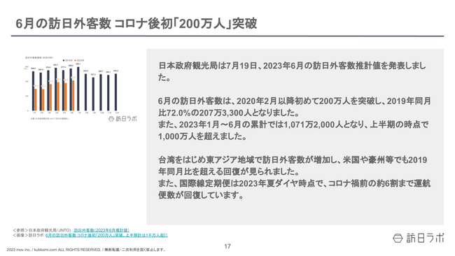 国内最大級のインバウンド総合メディア「訪日ラボ」を運営する株式会社mov(代表取締役:渡邊 誠、本社:東京都渋谷区、以下mov)は、「インバウンドに関連する政府&自治体などの取り組み」「各国の出入国の動向」を始め、インバウンド対策に役立つニュースをまとめた「インバウンド動向まとめ【2023年6月〜7月版】」を公開しました。
