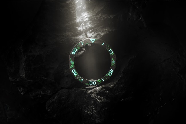 蛍光色がはっきりと見えるように、スティールケースはブラックDLCでコーティング。ベゼルのインサートはカー ボンとグリーンのスーパールミノバ(R)を組み合わせています。これが、時間が経つにつれ自然に生じる岩の稜線のように、他の時計とは一線を画す独自の魅力を生み出しています。特殊なダイヤルは、太陽光でムーブメントを充電できるように一部が透明になっています。そして、北極の夜空で輝く美しいオーロラの光を思わせる力強く個性的なブルーグリーンの色合い。アクアレーサーのアウトドア哲学を美しく体現しています。