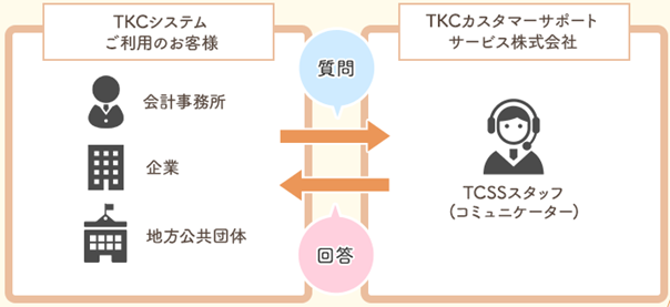 TKCカスタマーサポートサービス株式会社(TCSS)は、株式会社TKCの100%出資の子会社で、コールセンターサービスを専門にしています。TKCのシステムやサービスをご利用のユーザーからの問い合わせに電話やメールで回答することを業務としています。