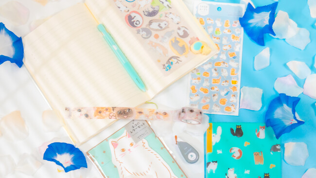 また、質が高く、海外でも人気な日本の文房具メーカー「ミドリ」のA5サイズのノートも入っており、同じボックス内に入っている全てのアイテムをノートに貼ったり書いたり、試すことができるようになっています。またA5サイズの猫ファイルはフタ付きで、シールを入れて持ち運ぶ際にも散らかることもなく、とても実用的なアイテムです。ただ可愛いだけでなく、ボックス内のアイテム同士の互換性や実用性も考慮しました。