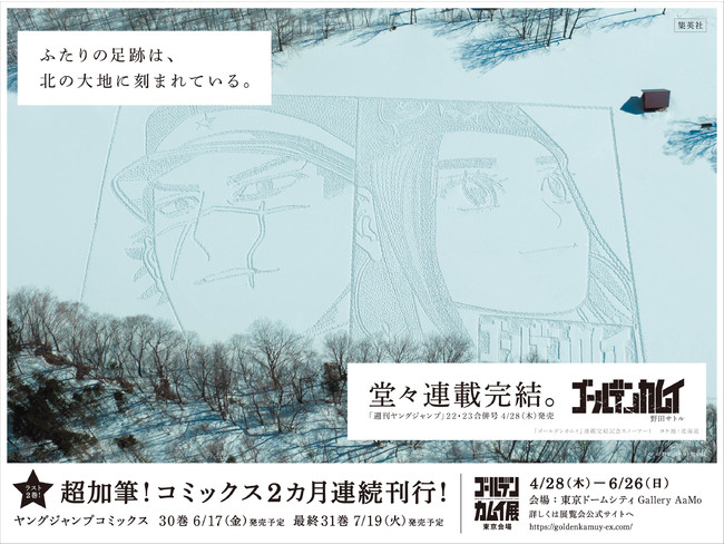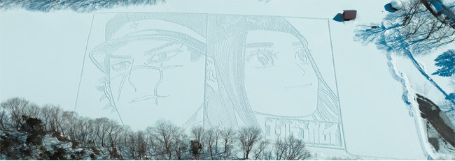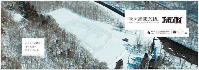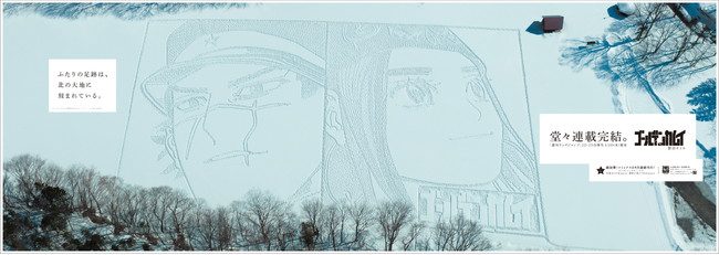 これを記念して、物語の舞台である北海道の雪原にアシ(リ)パと杉元を描く様子を収めたWEB動画および駅広告などによるビジュアル<THE SNOW COMIC>を公開します。 連載完結の記念に、そして約8年間の連載期間を共に歩んでくれた読者の方々への感謝を込めて、北海道在住のスノーアーティスト梶山智大さん協力のもと、足跡のみで約100m×70mという規模の巨大な絵を描きました。