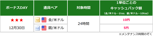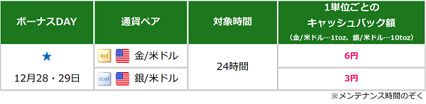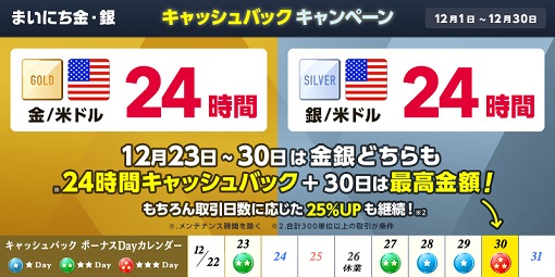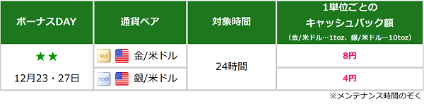12月23日より、「金/米ドル」・「銀/米ドル」における新規・決済約定数量の合計に対して、下記表のとおり24時間上限なしでキャッシュバックいたします。