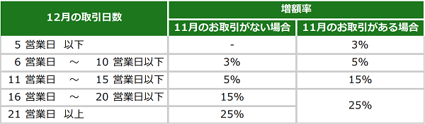 キャッシュバックキャンペーンでは、期間中にキャッシュバック対象となる取引をされた日数に応じて、最終キャッシュバック額から以下の通り増額いたします。なお、11月中(11月1日 8:10〜12月1日 6:30)に銘柄・数量を問わず1度(新規・決済いずれか)でも「まいにち金・銀」で取引をされた方には、お取引日数を+5日分とカウントし、増額率3%からスタートといたします。