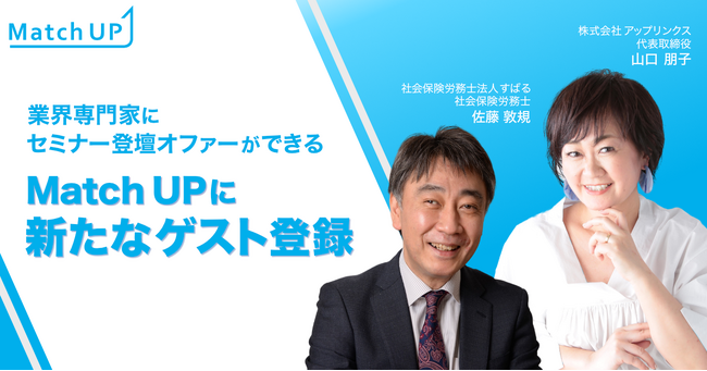業界専門家にセミナー/イベント登壇のオファーができる「Match UP」社会保険労務士法人すばるの佐藤 敦規氏、株式会社アップリンクスの山口 朋子氏などが新たにゲスト登録!
