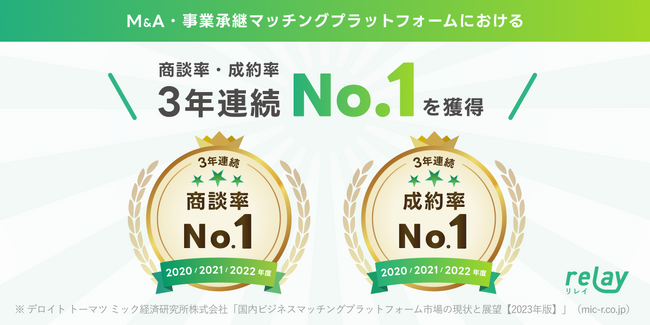 デロイト トーマツ ミック経済研究所株式会社が調査した、「国内ビジネスマッチングプラットフォーム市場の現状と展望【2023年版】」(mic-r.co.jp)にて、事業承継マッチングプラットフォーム「 relay(リレイ)」が M&A・事業承継マッチングプラットフォームにおける2022年度商談率・成約率(※1)の2冠を獲得いたしました。2020年・2021年に続き3年連続No.1となります。(※2)