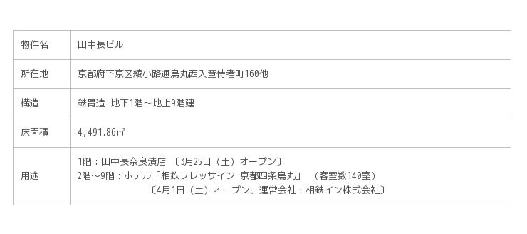 株式会社レオパレス21(本社:東京都中野区、社長:深山英世)は、京都のビジネスの中心かつ観光地へのアクセスに優れた四条烏丸で、「田中長奈良漬店(タナカチョウナラヅケテン)」とホテル「相鉄フレッサイン」の複合建築物『田中長ビル』を施工しました。「田中長奈良漬店」は3月25日(土)より営業を開始しており、「相鉄フレッサイン 京都四条烏丸」は4月1日(土)から営業を開始します。