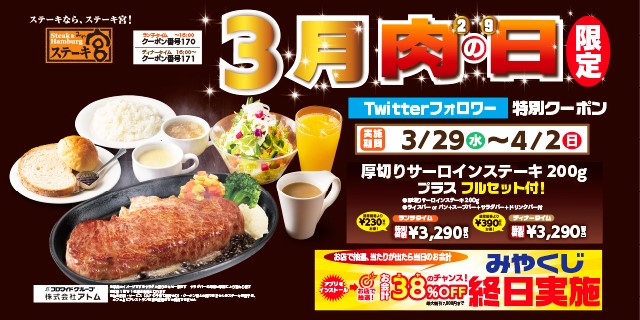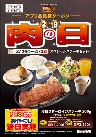 毎月恒例3月の「肉の日」企画は、5日間限定「厚切りサーロインステーキ200g+フルセット」