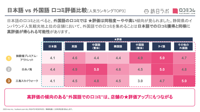 日本語の口コミと比べると、外国語の口コミでは ★評価は同程度〜やや高い傾向となりました。静岡県のインバウンド人気観光地上位の店舗において、外国語での口コミを集めることは日本語での口コミ獲得と同様に高評価が得られる可能性があります。