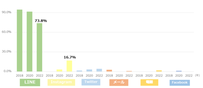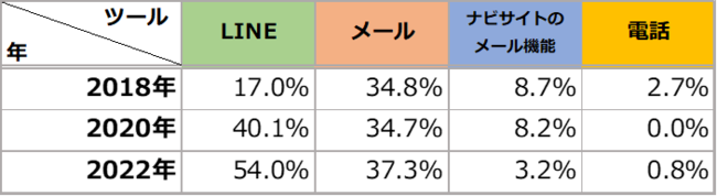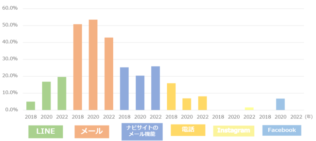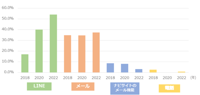 ● 「LINE」は2020年から13.9ポイント増加し、2年連続1位に。「ナビサイトのメール機能」は年々減少傾向になっています。