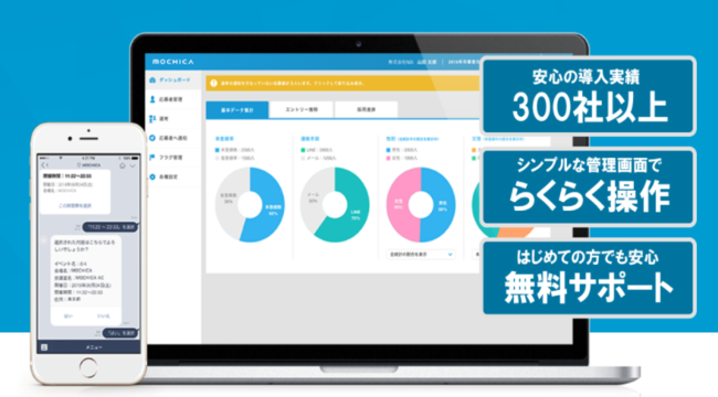 「MOCHICA(モチカ)」とは、LINE連携可能な採用コミュニケーションツールです。採用管理機能も搭載しており、求人サイトの応募者一括管理や、選考進捗管理・分析を一手に行うことができます。応募者とのメッセージのやり取りでは、LINE公式アカウントの機能を搭載しているため、導入企業は応募者との連絡をLINEで行うことが可能。また応募者の希望に合わせて、メッセージのやり取りの方法を、LINEまたは電子メールから選ぶことができます。