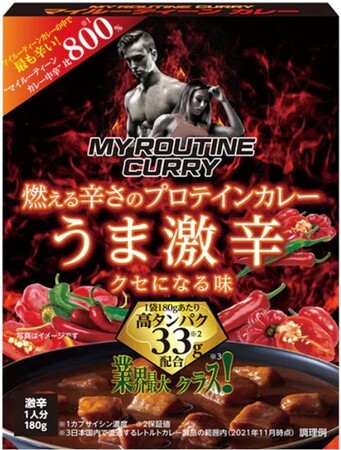 「うま激辛」のタンパク質量は、1食180g当たりなんと36.5g。レトルトカレーの中でも最大級の量が配合されています。