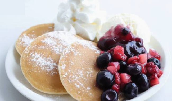 たっぷりの甘酸っぱいミックスベリーが生クリームとマッチしたパンケーキ。ランチにもデザートにもおすすめ。他にも2種類のパンケーキをご用意し、キャラメルナッツチョコバナナとソーセジエッグ&ケチャップがございます。
