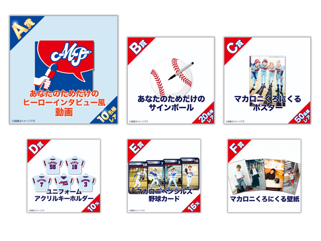他にもここでしか手に入らない、『マカロニくろにくるポスター』や『ユニフォームアクリルキーホルダー』、『マカロニペンシルズ野球カード』、アニバーサリーブックの未公開オフショットを含む『マカロニくろにくる壁紙』など、いずれかの特典が当たるハズレなしのくじです。