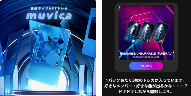 エンターテイメント領域のDXを志すスタートアップスタジオStudio ENTREが開発している音楽ライブNFTトレカ「MUVICA」にてライブ動画をNFTとして販売します。動画は数十秒の短尺動画の3枚パックでトレカ形式に変換されます。なお、販売対象はオリジナル楽曲でのライブ映像のみとなります。