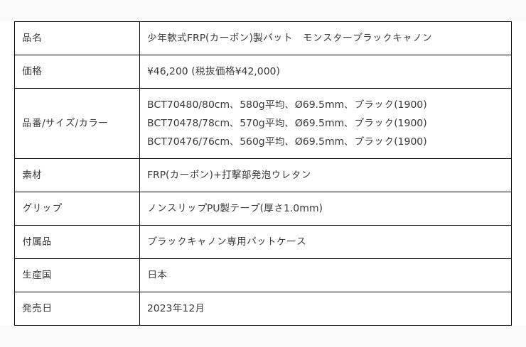 「ベースボールを科学する。」ゼット株式会社(本社/大阪市天王寺区、代表取締役社長/渡辺裕之)は、史上最厚の打撃部発泡ウレタン構造(※当社比)により爆飛を生む少年軟式FRP(カーボン)製バット【モンスターブラックキャノン】を新発売します。