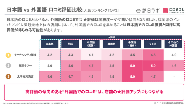 日本語の口コミと比べると、外国語の口コミでは ★評価は同程度〜やや高い傾向となりました。福岡県のインバウンド人気観光地上位の店舗において、外国語での口コミを集めることは日本語での口コミ獲得と同様に高評価が得られる可能性があります。