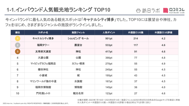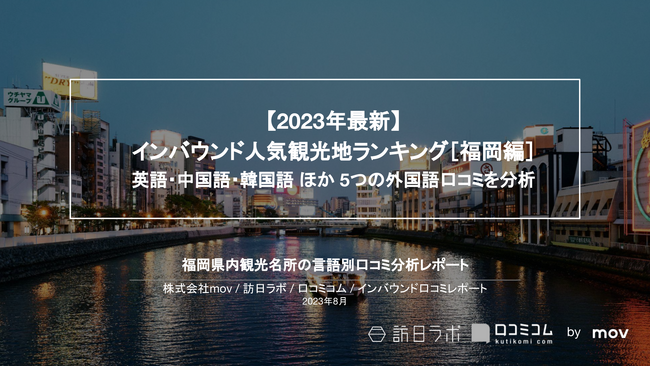 国内最大級のインバウンド総合メディア「訪日ラボ」及び 口コミサイトを”もっと”売上に変える店舗支援SaaS「口コミコム」を運営する株式会社mov(代表取締役:渡邊 誠、本社:東京都渋谷区、以下mov)は、観光名所に寄せられた最新の口コミデータから、独自の『インバウンド人気観光地ランキング』を発表しました。