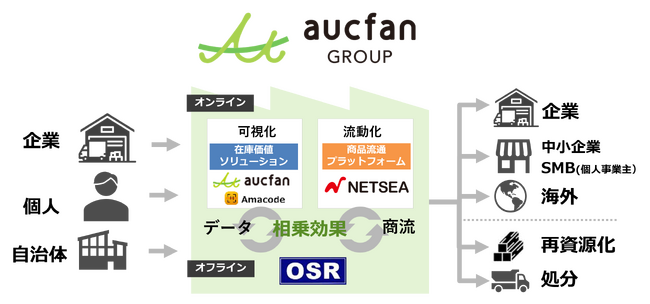 事業においては、創業来培った売買データにより、価格と販路を最適化する「aucfan.com(オークファン)」、小売・流通業向けのプラットフォーム「NETSEA(ネッシー)」「NETSEAオークション」をSMB(中小企業・個人事業主)に向け展開しております。