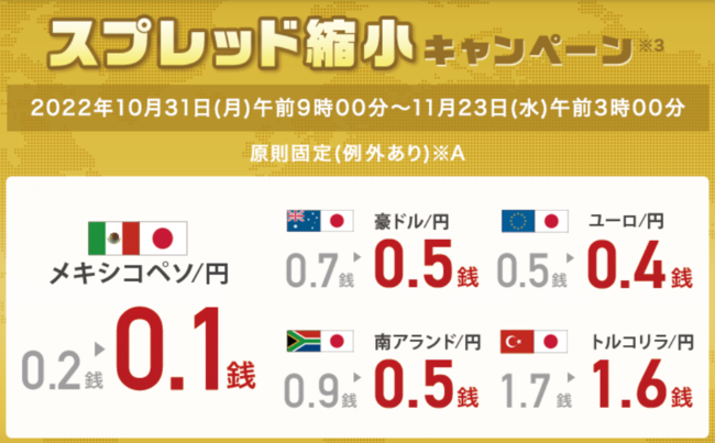 ※3 「提示時間帯拡大!スプレッド縮小キャンペーン」スプレッド(対象期間:2022年10月31日(月)午前9時00分〜2022年11月23日(水)午前3時00分、提示時間帯:対象期間中の各営業日午前9時〜翌午前3時)