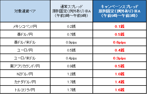 ※キャンペーンスプレッドの提示時間帯はすべて対象期間中の各営業日の午前9時〜翌午前3時。同期間中の通常スプレッドは各営業日の午前3時〜午前9時に提示。