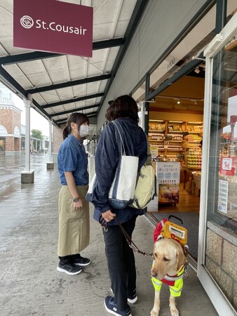 さらには、東日本盲導犬協会の職員が盲導犬(PR犬)を伴い、希望のあった17店舗の店内で模擬接客研修を行いました。参加店舗では、盲導犬ユーザーと盲導犬(PR犬)を店内の通路やレイアウトに合わせて実際に誘導し、商品提案やレジでの金銭授受、お見送りまで、一連の接客を行いました。参加者は、視覚障害をお持ちのお客様がショッピングを安心して楽しめるように、実際に商品に触れていただき、イメージを伝えるなど工夫を凝らし、お客様との会話を楽しみながらも、視覚情報を具体的に言葉にして分かりやすく正確に伝えることの難しさを学びました。