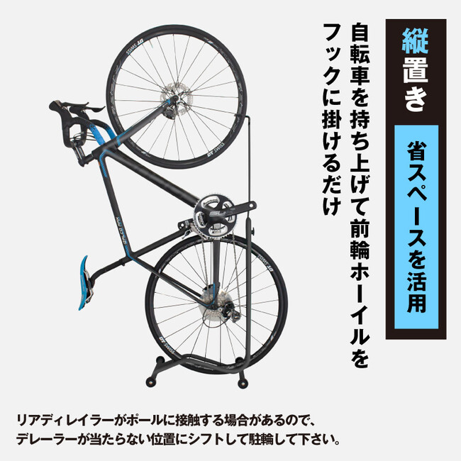 ※製品構造上、縦置き時リアディレイラーがポールに接触する場合があるので、接触する場合はリアディレイラーが当たらない位置にシフトチェンジして下さい。