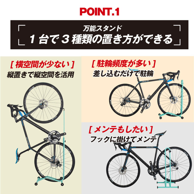3タイプの置き方でマルチに使える自転車用スタンド ロードバイク・マウンテンバイク・クロスバイク・ミニベロに最適なホイール差込式スタンドです。