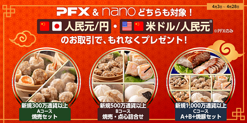 株式会社マネーパートナーズ(本社:東京都港区、代表取締役社長:福島秀治)は、2023年4月3日より『パートナーズFX』「人民元/円・米ドル/人民元」および『パートナーズFXnano』「人民元/円」における、新規300万通貨以上のお取引をいただいた方へ、もれなく日本橋「小洞天」のグルメギフトセットをプレゼントするキャンペーンを実施いたします。