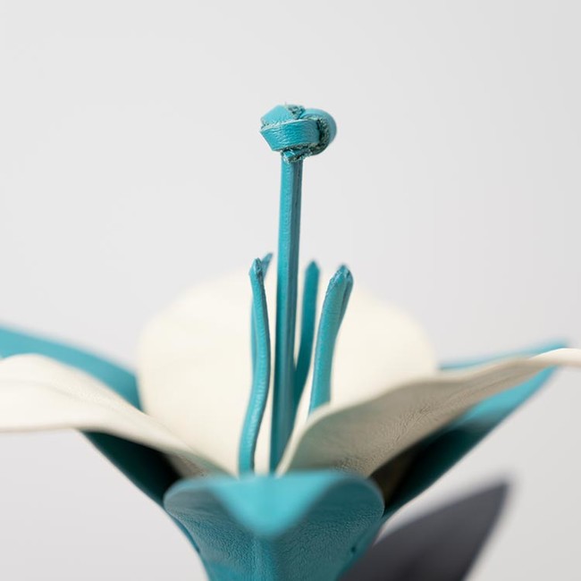 革の一輪花と革のブーケの花びらや葉は、本革を用いて一つひとつハンドメイドで製作しています。花びら、おしべ・めしべ、茎・葉などの各パーツの色はオリジナルカラー14色と限定カラー3色の計17色から選ぶことができます。また、革のブーケは1本ずつお好きな色が選択可能です。また、ユリの花のおしべとめしべは革の細さや長さを細かく調整し本物のユリに近づけるようこだわりました。ユリの葉は、バラとガーベラの革の花よりも1枚多く3枚付いており、一番下の葉の表面にはアルファベットでイニシャルや「THANKS」などのメッセージを刻印することができます。今回はユリの革の一輪花とHARIOのアロマデュフューザーとのセット商品も販売します。HARIOのアロマディフューザーは、革の一輪花を挿し、花瓶のようにお使いいただくことができます。