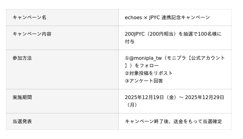 データとクリエイティブの力でマーケティングコミュニケーションを設計し、企業のマーケティングAXを支援するアライドアーキテクツ株式会社(本社:東京都渋谷区、取締役社長:村岡弥真人、証券コード : 6081、以下「当社」)と、JPYC株式会社(本社:東京都千代田区、代表取締役:岡部 典孝、以下「JPYC社」)は、アライドアーキテクツが提供するXキャンペーン支援ツール「echoes(エコーズ)」において、キャンペーンインセンティブとして日本円建ステーブルコイン「JPYC」を活用できる新機能の提供を開始したことをお知らせいたします。