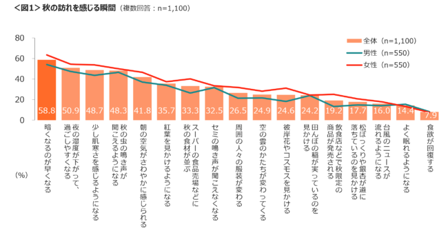 秋の訪れを感じる瞬間は、「暗くなるのが早くなる」が58.8%で最多。<図1>